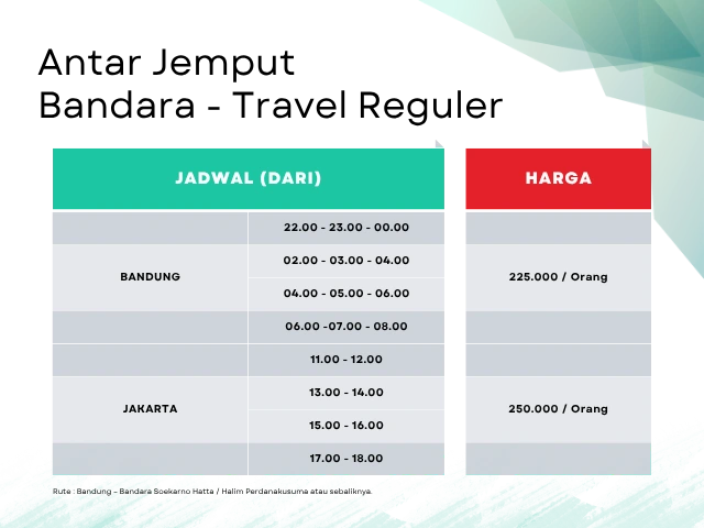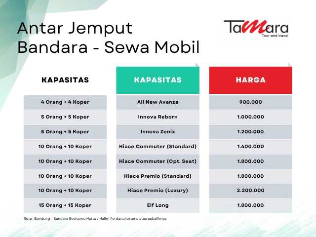 Butuh transportasi nyaman dan aman dari Bandung menuju Bandara Soekarno Hatta? Tamara Travel hadir untuk memberikan solusi terbaik perjalanan Anda. Kami menyediakan layanan antar jemput bandara dengan dua pilihan fleksibel: travel reguler dengan harga terjangkau per orang, atau sewa mobil pribadi untuk Anda yang ingin lebih eksklusif dan leluasa.